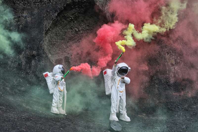 8月10日,山西大同,游客身着宇航服在大同火山群国家地质公园内拍照打卡。视觉中国供图