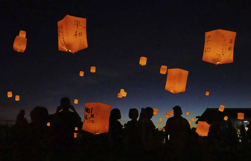 当地时间8月15日,日本大分县宇佐市,二战结束80周年之际,民众在放飞写有和平祝愿及其他信息的孔明灯进行祈祷。视觉中国供图