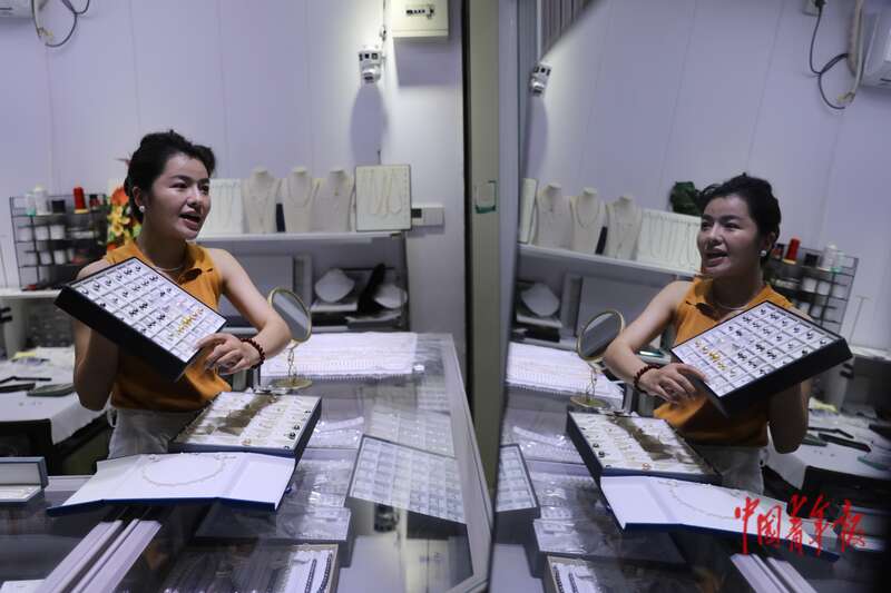 8月9日,浙江绍兴诸暨华东国际珠宝城,四川成都人彬彬正在介绍自家的珍珠饰品。彬彬今年31岁,播音主持专业毕业的她4年前因为直播开始接触珍珠行业,后来在诸暨开了店。她认为近年来社交媒体的传播让诸暨珍珠被更多人了解、熟知,不再是专属于高消费群体的“奢侈品”。越来越多游客把这里当成旅行中的一站,在不同品相、价位的珍珠中现场挑选自己心仪的款式,或是买来作为礼物送给亲朋好友。中青报·中青网记者 孔斯琪/摄