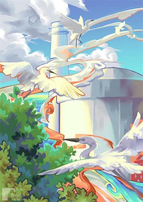 孟芮妍作品,描绘了栖息在中国大陆第一座核电站——秦山核电站的白鹭和秦山核电站的外观。受访者供图