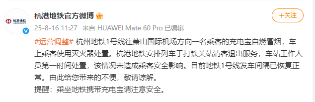 潮新闻记者从杭港地铁了解到,8月16日10:32,杭州地铁1号线往萧山国际机场方向,列车司机接到乘客通过紧急通话装置反馈车厢内有乘客充电宝自燃冒烟,车上乘客使用灭火器处置。