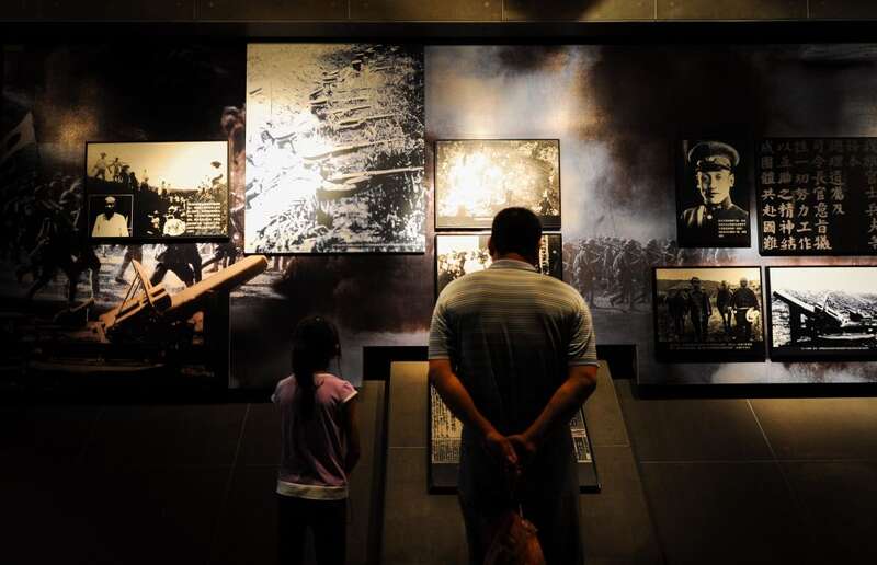 2013年8月15日,吉林省长春市各界人士来到位于伪满皇宫博物院内的东北沦陷史纪念馆,参观日本侵略中国东北史实展览,缅怀抗战英烈。这是一对父女在参观展览。