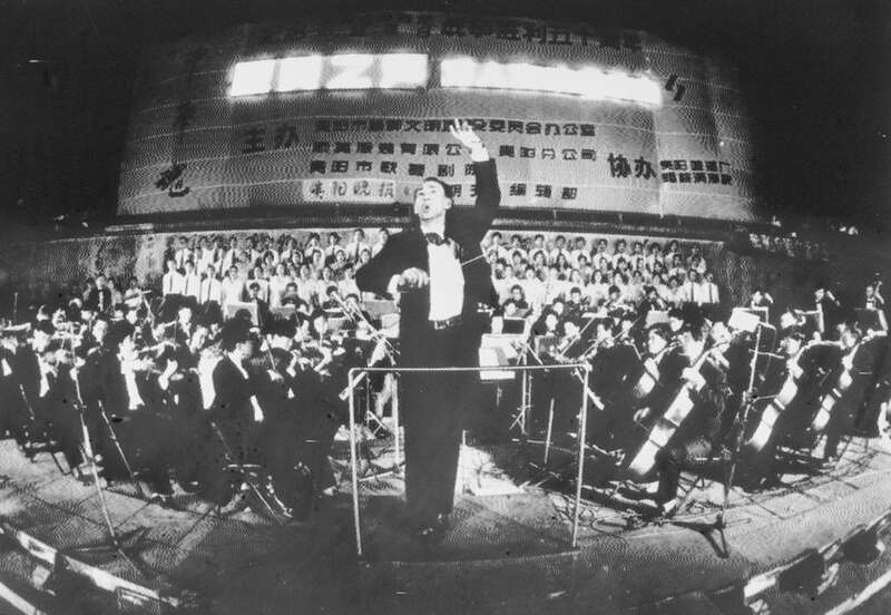 1995年8月15日,在贵阳市人民广场举行的万人露天交响音乐会上,演员和万余名市民高唱《义勇军进行曲》。
