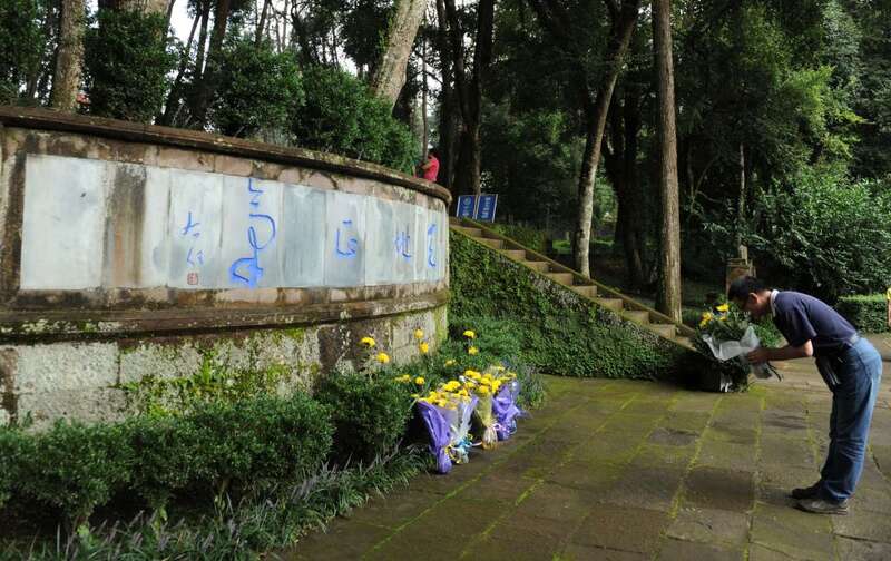 2012年8月15日,云南腾冲各地群众前往“国殇墓园”和“腾冲滇西抗战博物馆”等爱国主义教育基地,祭奠抗战先烈。这是一位市民在“国殇墓园”缅怀英烈。