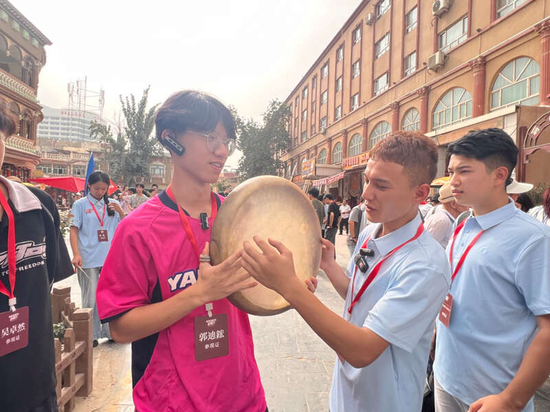 在莎车县老城喀赞其街,新疆青少年指导澳门青少年使用民族乐器。中青报·中青网记者 赵婷婷/摄