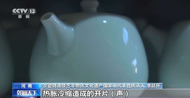 汝瓷烧造技艺非物质文化遗产国家级代表性传承人 李廷怀:这个风铃般的声音就是瓷器胎子收缩,釉子膨胀,热胀冷缩造成的开片声。古人给我们留下了美丽的陶瓷艺术,我们不光要传承,更要创新。