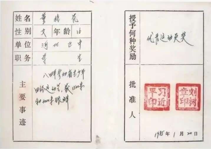当时就读于正定中学16岁的董桂花获得了“优秀运动员奖”,获奖证书红彤彤的封皮上印有“县委书记、县长奖励”字样,证书右下角的批准人一栏盖着习近平的红色印章。