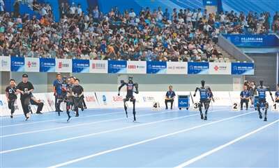 备受瞩目的100米“飞人大战”决赛在8月17日下午开赛,具身天工Ultra机器人(右二)以21.50秒的成绩斩获金牌。人民日报记者 王昊男摄