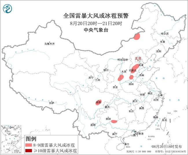 中央气象台8月20日18时发布强对流天气蓝色预警:预计8月20日20时至21日20时,内蒙古中东部、西北地区东部、华北大部、东北地区南部、西南地区东部、江南中东部、华南西部等地的部分地区将有小时雨量大于20毫米的短时强降水天气,其中,辽宁中北部、陕西南部、河北中南部和东北部、北京北部山区和东南部、天津、湖北西北部、四川盆地中西部、贵州西南部、云南东北部、广西北部等地的部分地区小时雨量大于50毫米,最大可达80毫米以上;陕西中部、山西东部、河北中南部、河南北部、四川盆地中部、贵州东南部等地的部分地区将有8级以上雷暴大风或冰雹天气。