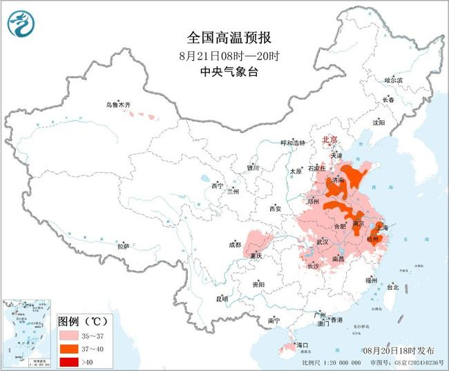 中央气象台8月20日18时继续发布高温黄色预警:预计8月21日白天,河北南部、山东、河南大部、安徽、江苏、上海大部、湖北北部和东部、湖南中北部、江西中北部、浙江中北部、四川盆地东北部和中部、重庆中西部等地有35~36℃高温天气,其中,山东东部和南部、河南东部、安徽北部和东部、江苏南部、上海、浙江北部等地部分地区最高气温37~39℃。