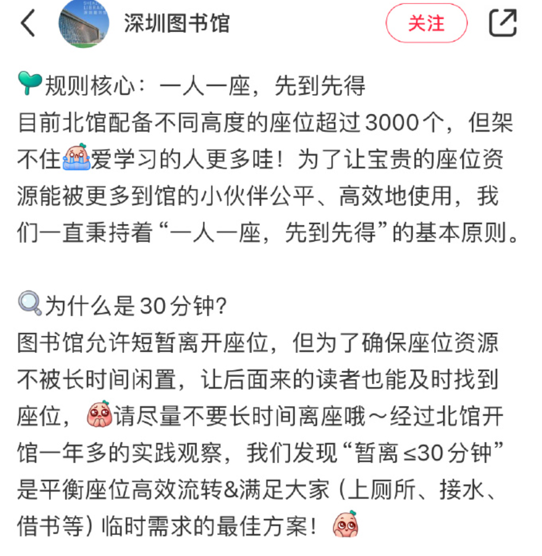 深圳图书馆相关负责人回应称,为在暑期人流量高峰期公平高效地分配座位资源,图书馆实施了此规定。非用餐时段离座超过30分钟,用餐时段离座超过60分钟的座位,经工作人员两次巡查确认无人使用,该座位将释放供其他读者使用。