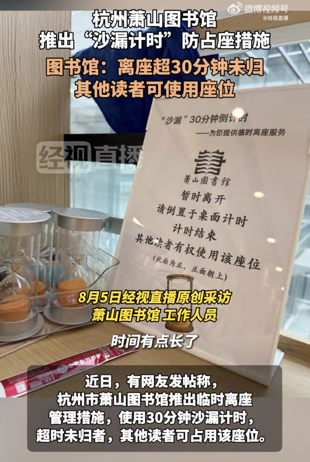 此外,有网友发帖称,杭州市萧山图书馆也推出了临时离座管理措施——使用30分钟沙漏计时,超时未归者,其他读者可占用该座位。
