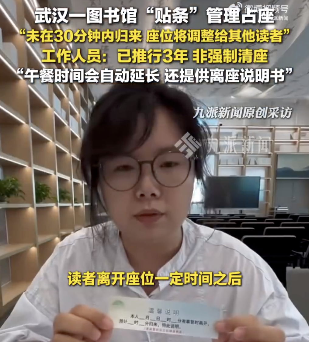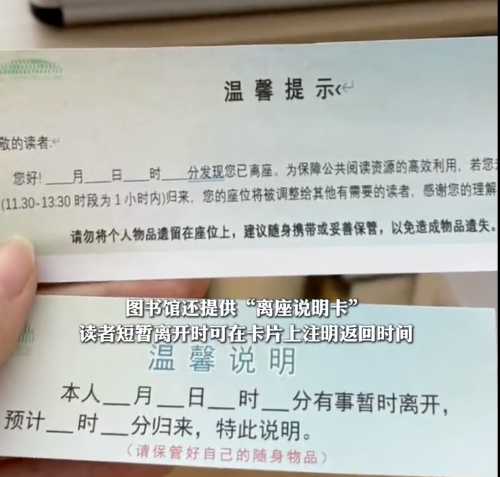 另据九派新闻报道,还有网友发帖称,因在湖北武汉东西湖区图书馆内暂时离座而被“贴条”。提示上写明,若未能在30分钟内归来,您的座位将被调整给其他有需要的读者。