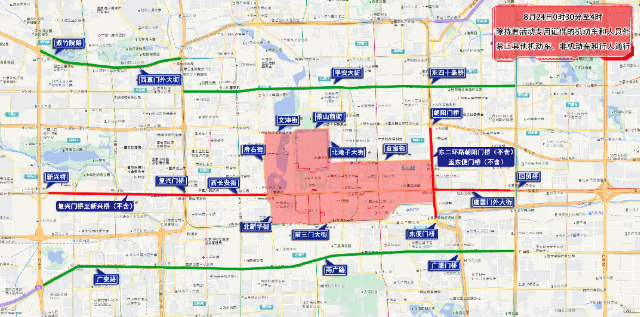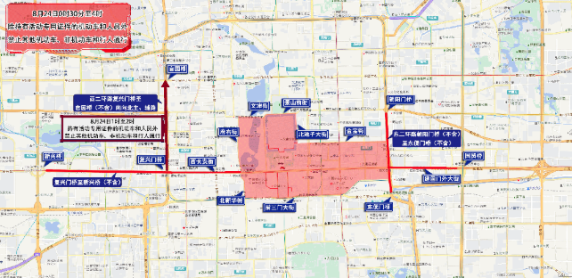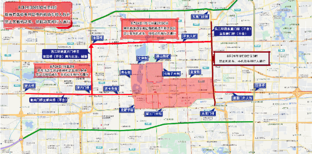 十二、8月24日1时10分至2时30分,平安里西大街,地安门西大街,地安门东大街,张自忠路至东四十条桥,除持有活动专用证件的机动车和人员外,禁止其他机动车、非机动车和行人通行。