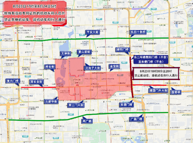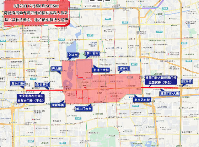 八、8月23日17时至8月24日5时,由府右街北口经府右街、北新华街至和平门路口向东,经前三门大街至崇文门路口,经北京站西街(不含南侧半幅)、北京站东街(不含南侧半幅)至北京站东街东口(不含)向北,经东二环西侧辅路(不含)至金宝街东口(不含)向西,经金宝街、金鱼胡同、东安门大街、东华门大街至东华门路口向北,经北池子大街、景山前街、文津街至府右街北口以内区域;长安街由府右街南口至复兴门桥(不含);建国门外大街由建国门桥至国贸桥(不含);除持有活动专用证件的机动车和人员外,禁止其他机动车、非机动车和行人通行,区域内居民可凭身份证等有效证件步行进入。