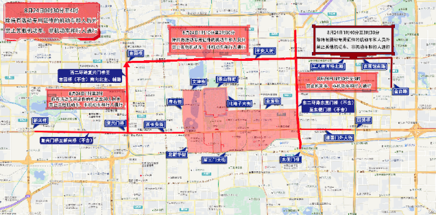 8月20日,北京市公安局公安交通管理局发布关于对部分道路采取临时交通管理措施的通告:为保障专项活动安全顺利,根据道路交通安全法律法规有关规定,决定对天安门地区及相关道路分时、分段采取临时交通管理措施。具体如下——