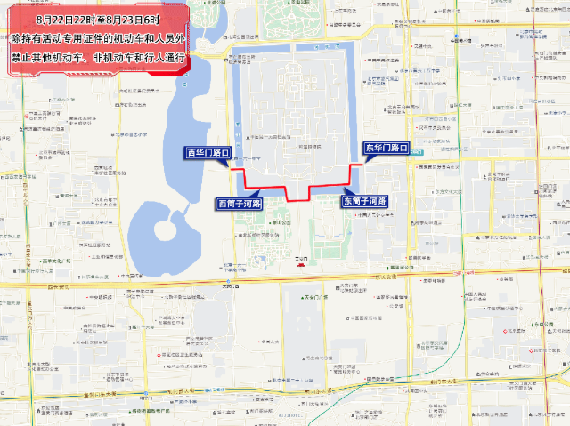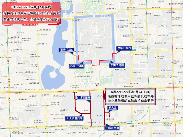 一、8月22日22时至8月23日6时,西华门路口(不含)经西华门大街、西筒子河路、东筒子河路、东华门大街至东华门路口(不含),除持有活动专用证件的机动车和人员外,禁止其他机动车、非机动车和行人通行。
