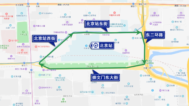 十五、前往北京站的机动车和非机动车,可由东二环路东便门桥、崇文门东大街、北京站西街、北京站东街、东二环路单向循环通行。