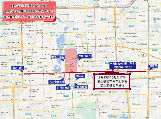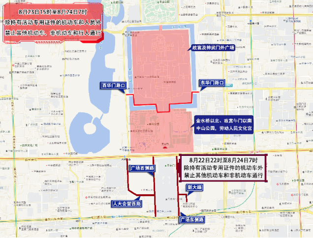 四、8月23日15时至8月24日7时,天安门前金水桥以北、故宫午门以南地区,中山公园,劳动人民文化宫,故宫及神武门外广场,西华门路口(不含)经西华门大街、西筒子河路、东筒子河路、东华门大街至东华门路口(不含),除持有活动专用证件的机动车和人员外,禁止其他机动车、非机动车和行人通行。