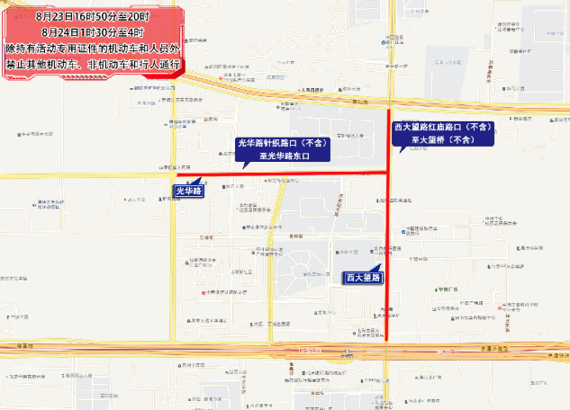六、8月23日16时50分至20时,8月24日1时30分至4时,西大望路由红庙路口(不含)至大望桥(不含),光华路由针织路口(不含)至光华路东口,除持有活动专用证件的机动车和人员外,禁止其他机动车、非机动车和行人通行。