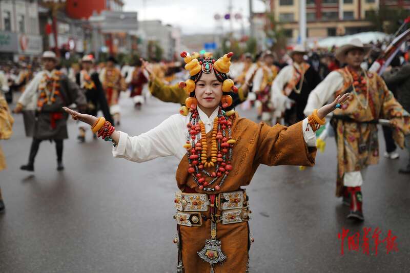 8月20日,青海省玉树藏族自治州囊谦县,当地的年轻人在进行传统服饰展演。中青报·中青网记者 孔斯琪/摄