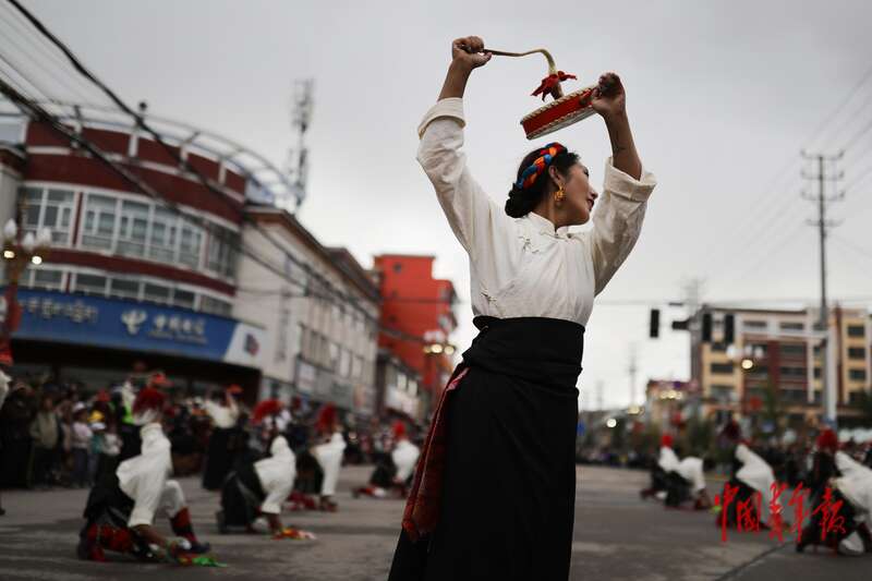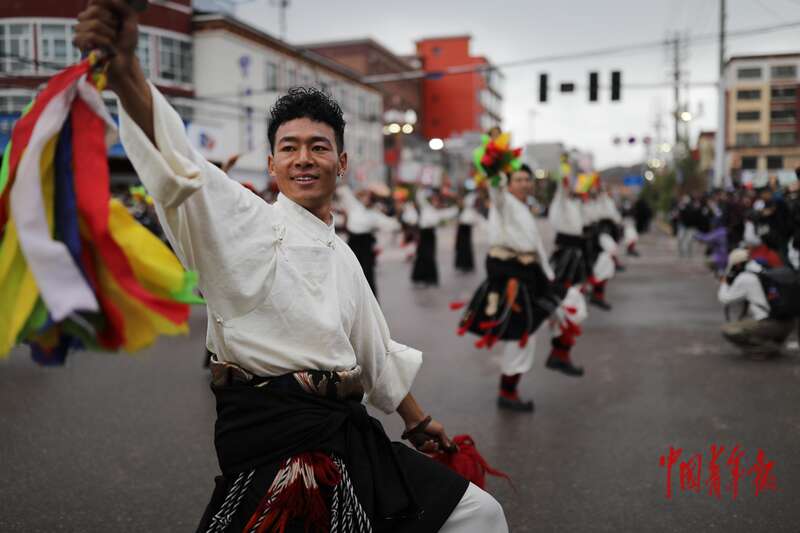 8月20日,青海省玉树藏族自治州囊谦县,当地的年轻人在进行传统服饰展演。澜沧江-湄公河发源于青藏高原、青海省玉树藏族自治州,蜿蜒4880公里,将中国、缅甸、老挝、泰国、柬埔寨、越南六国紧紧相连。当日,当地民众沿街载歌载舞,欢迎前来参加2025澜湄国际影像周的澜沧江-湄公河流域各国青年代表和相关嘉宾。中青报·中青网记者 孔斯琪/摄