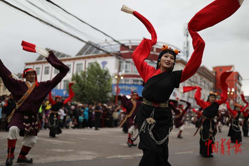 8月20日,青海省玉树藏族自治州囊谦县,当地的年轻人在表演囊谦热巴舞。中青报·中青网记者 孔斯琪/摄