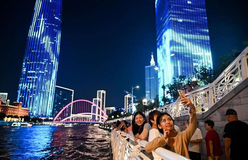 2025年8月11日,游客在天津海河岸边拍照打卡。新华社记者 赵子硕 摄