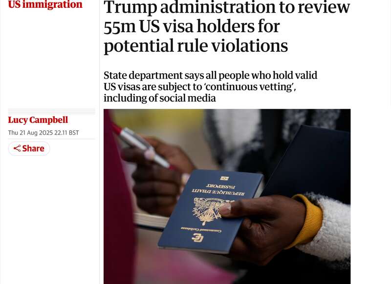 中国青年报客户端北京8月22日电(中青报·中青网记者 张昊天)美国政府对外籍人员的管控再度升级。当地时间8月21日,美联社、《国会山报》等多家美媒援引美国国务院的消息称,特朗普政府正在对超过5500万名美国签证持有者进行审查;一旦被发现存在“不当行为”,相关人员可能被吊销签证甚至驱逐出境。