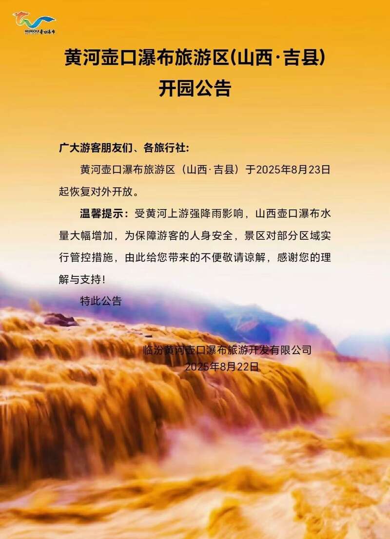 受黄河中上游持续强降雨影响,黄河壶口瀑布旅游区曾一度采取临时关闭措施。随着洪峰过境后,黄河水量降低,黄河壶口瀑布旅游区将于23日恢复对外开放。