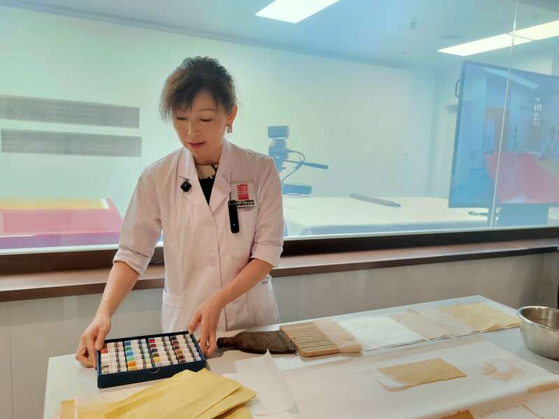 8月21日,北京大运河博物馆文物保护中心内,工作人员马燕现场演示“染纸”工艺。陈玺炀/摄