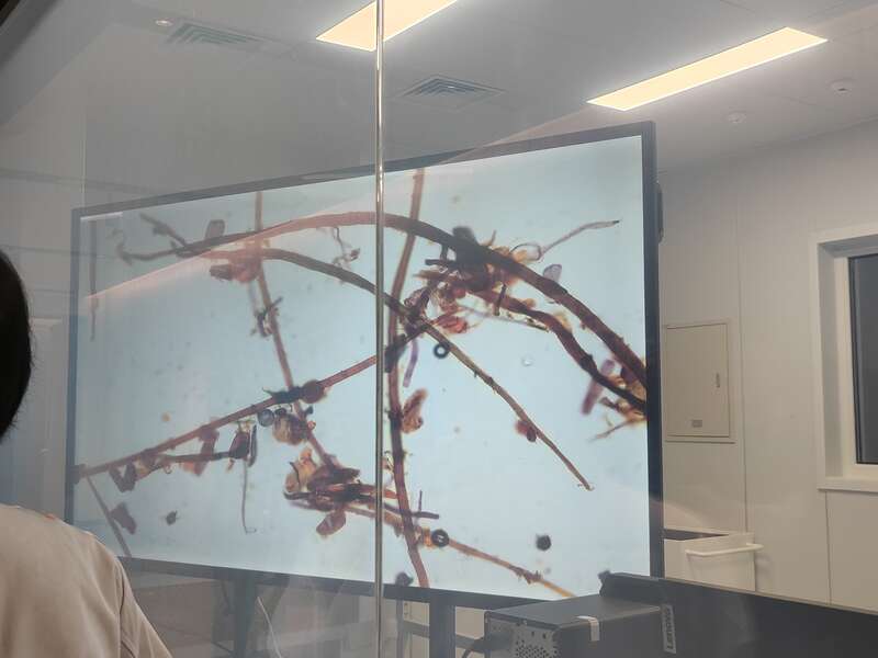 8月21日,文物修复人员展示造纸纤维分析仪下的元书纸纤维。陈玺炀/摄