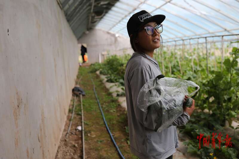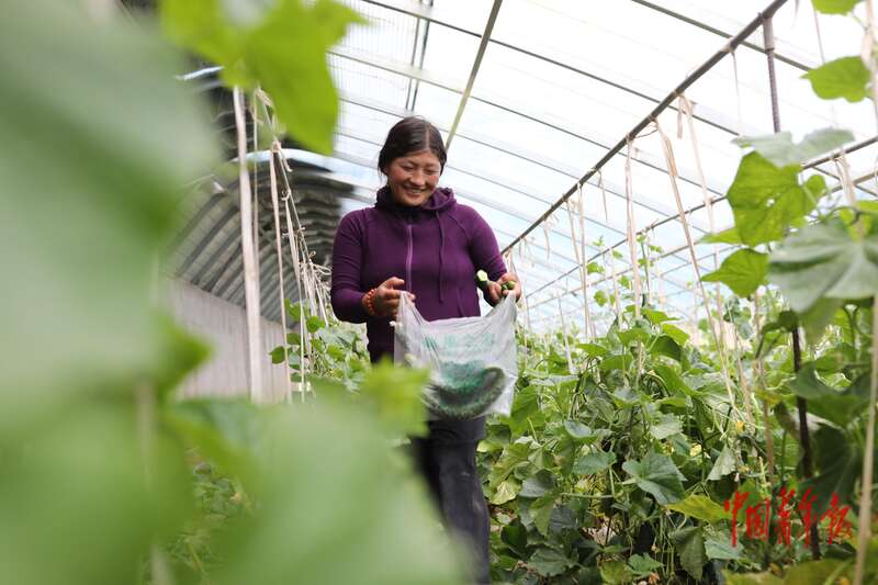 8月21日,青海省玉树藏族自治州囊谦县娘拉乡娘麦村,巴金在蔬菜大棚里采摘黄瓜。中青报·中青网记者 孔斯琪/摄