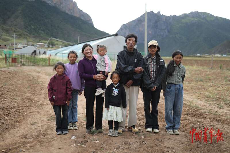 8月21日,青海省玉树藏族自治州囊谦县娘拉乡娘麦村,成林(右三)与妻子巴金(左三)和他们的孩子们。他们身后的温室大棚,为附近村民、食堂和学校提供新鲜的蔬菜。囊谦县娘拉乡位于三江源腹地,海拔近4000米,周边多山,大多数居民靠放牧为生。当地夏季时间短,但光照十分充足,成林由此萌生了在这片山脚下的平原搭建温室大棚、种植新鲜果蔬的念头。经过几年的尝试,2018年,成林成立了囊谦娘拉白吾仓种植养殖农民专业合作社,种植黑青稞、洋芋、芫根等农作物。2020年,在县委县政府、县农牧局的帮助和支持下,温棚的规模逐渐扩大,不仅为周边村民、学校带来了新鲜的蔬菜,也提供了更多就业岗位,带动村民们共同致富。中青报·中青网记者 孔斯琪/摄