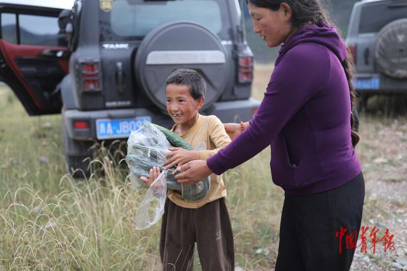 8月21日,青海省玉树藏族自治州囊谦县娘拉乡娘麦村,巴金将一袋刚摘下来的黄瓜送给住在附近的孩子。中青报·中青网记者 孔斯琪/摄