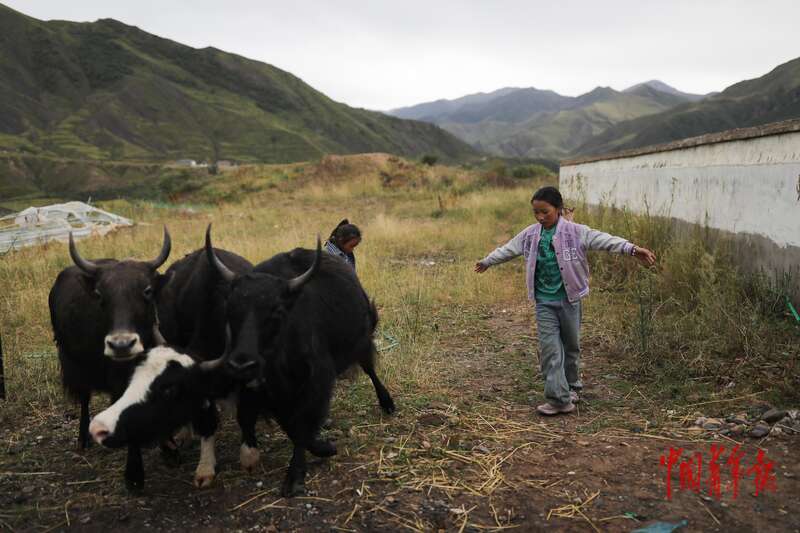 8月21日,青海省玉树藏族自治州囊谦县娘拉乡娘麦村,附近牧民家的孩子在赶牛。中青报·中青网记者 孔斯琪/摄