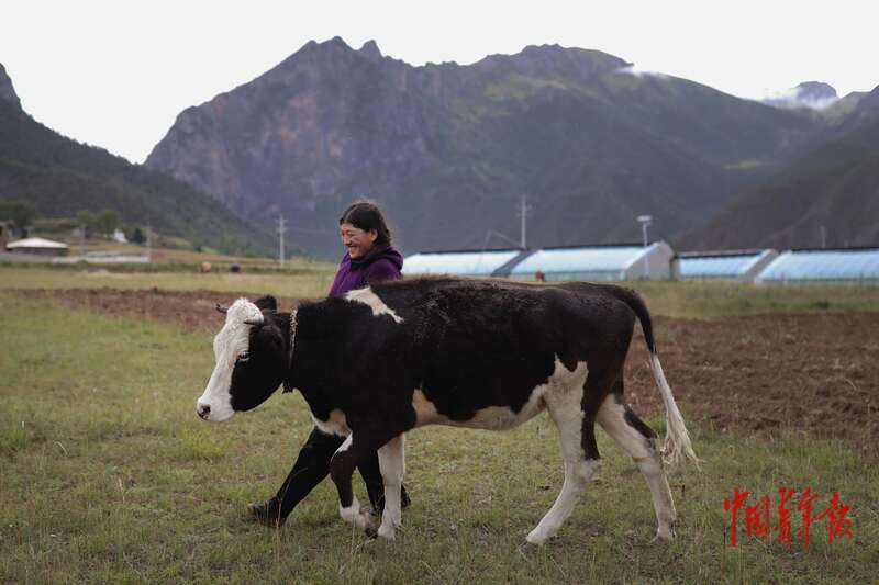 8月21日,青海省玉树藏族自治州囊谦县娘拉乡娘麦村,巴金牵着自家的牛从温室大棚前走过。中青报·中青网记者 孔斯琪/摄
