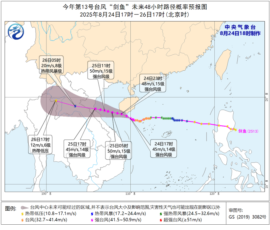 三亚市气象台2025年08月24日18时52分继续发布台风红色预警信号:目前“剑鱼”已加强为强台风级,未来12小时,三亚市沿海和陆地平均风力仍有12-13级,阵风14-16级,并伴有强降水,请有关单位和人员继续做好防范工作。