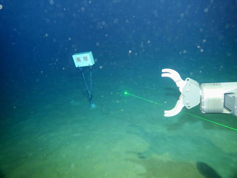 在“海琴”号水面监控动力站,12个整齐排列的显示屏,将“海琴”号在海里的一举一动尽收眼底。显示屏上数据不断跳动,海水越来越深,到4140米,坐底了!一阵细腻的泥尘,好似海底腾起的烟雾,让镜头前一片模糊。“海琴”号采集了海底沉积物样品并放置了标识。