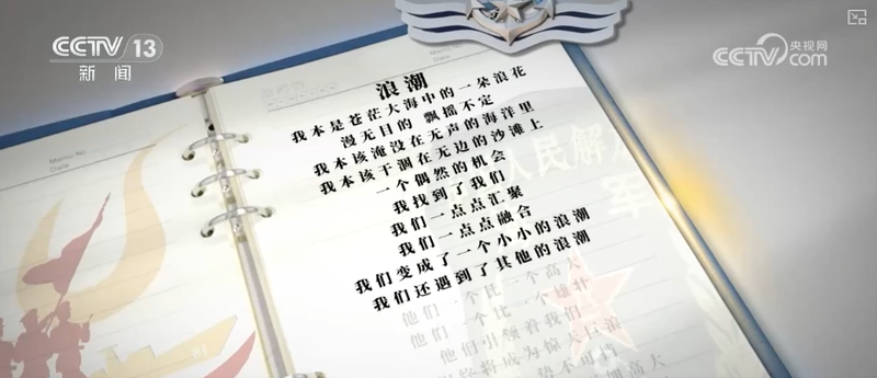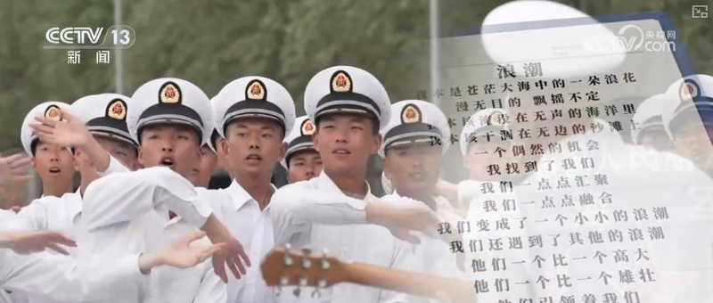 海军参阅队员朱文伟在诗中写道,我们遇到了其他的浪潮,他们一个比一个高大、一个比一个雄壮。这里的其他浪潮,其实有几层比喻,其中一层就是,曾经受阅过的海军先辈们,他们也是引领着我们的浪潮,但是他的诗里又写了,我们终将成为惊天巨浪,排山倒海势不可挡。