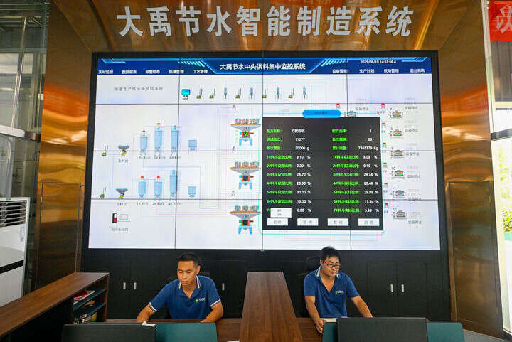 在天津的大禹节水集团股份有限公司,工作人员在监控生产车间的智能制造系统(2025年8月19日摄)。新华社记者 赵子硕 摄