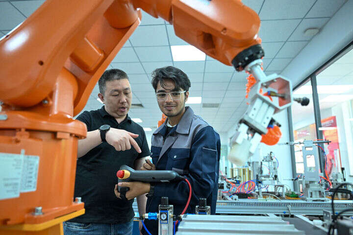 在天津现代职业技术学院鲁班工坊实训教室,教师指导学生操作设备(2025年6月16日摄)。新华社记者 孙凡越 摄