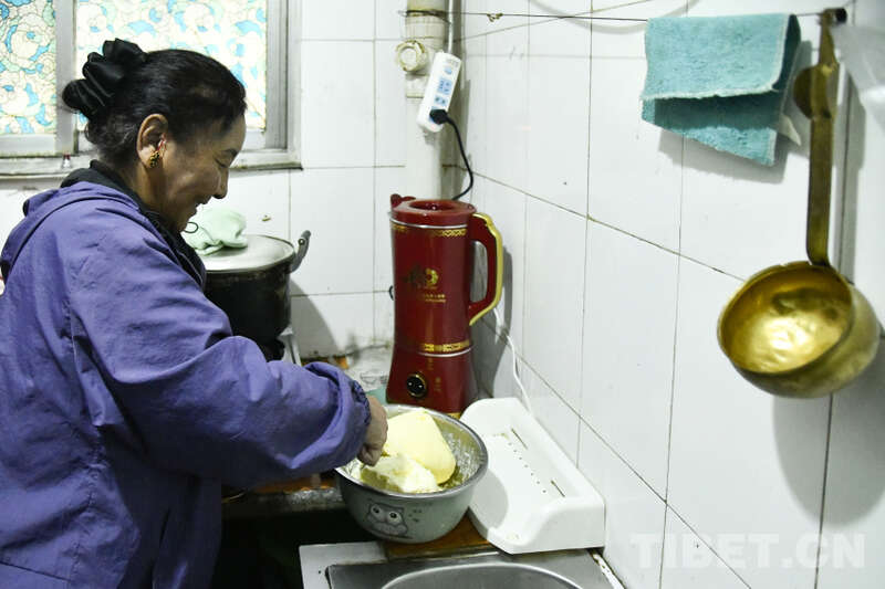 图为卓嘎将新鲜的酥油放入全自动酥油茶壶内 摄影:赵振宇