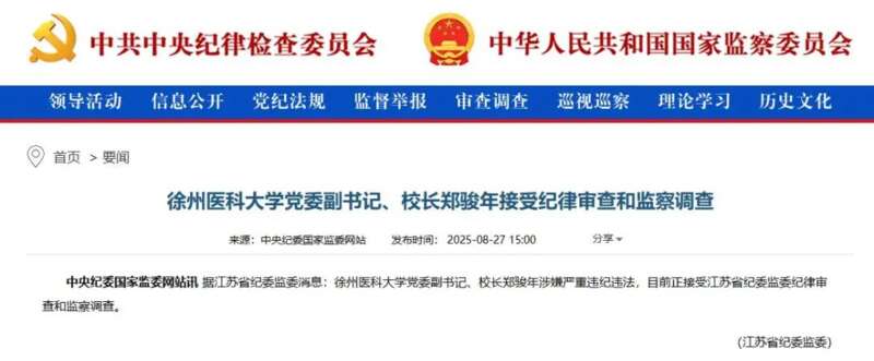 徐州医科大学党委副书记、校长郑骏年涉嫌严重违纪违法,目前正接受江苏省纪委监委纪律审查和监察调查。