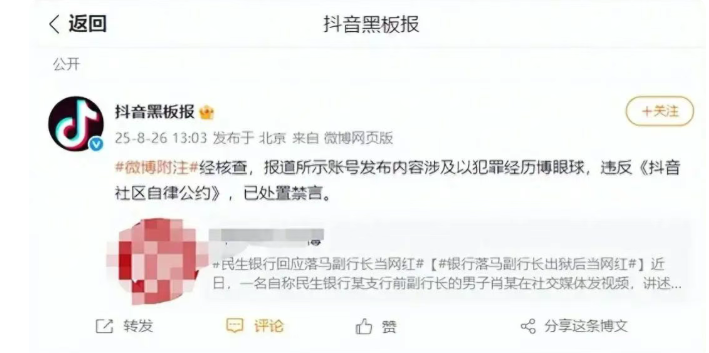 近日,一名自称为民生银行某支行前副行长的男子肖某,在社交媒体发布视频讲述入狱前的经历,短短几天涨粉2.2万。8月26日,抖音方面作出回应,经核查,该报道所涉账号发布的内容存在以犯罪经历博眼球的情况,违反了《抖音社区自律公约》,目前已对其作出禁言处置。