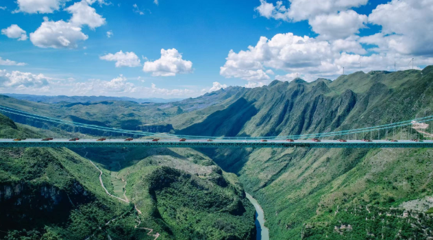 花江峡谷大桥全长2890米,主桥跨径1420米(山区桥梁跨径世界第一),桥面距水面垂直高度625米(世界第一高),如蓝色巨龙缝合“地球裂缝”。通车后,两岸通行时间将从2小时盘山路缩短至2分钟。