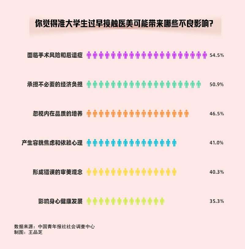 准大学生过早接触医美,54.5%的受访大学生认为可能面临手术风险和后遗症,50.9%的受访大学生认为会承担不必要的经济负担,46.5%的受访大学生认为会忽视内在品质的培养,41.0%的受访大学生认为会产生容貌焦虑和依赖心理,40.3%的受访大学生认为会形成错误的审美观念,35.3%的受访大学生认为会影响身心健康发展,17.7%的受访大学生认为会与家人在观念上产生分歧和矛盾,16.9%的受访大学生认为会过分注重外表而忽略学业。