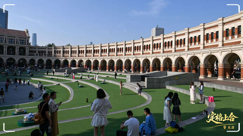 天津津湾广场,游客在一处“2025年上海合作组织峰会”主题装饰物打卡。