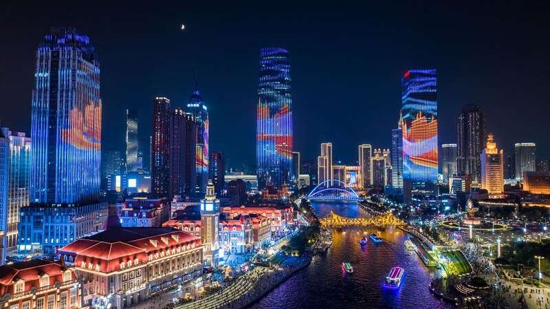 沙漠驼铃、中欧班列、远洋货轮等“上合图景”跃动于楼宇巨幕之上;海河上座座桥梁如长虹卧波,玉带蜿蜒令人流连忘返;街巷焕然一新,花木掩映,彩旗招展……渤海湾畔有着千年文明史、六百年建城史的天津盛装以待,喜迎2025年上海合作组织峰会。