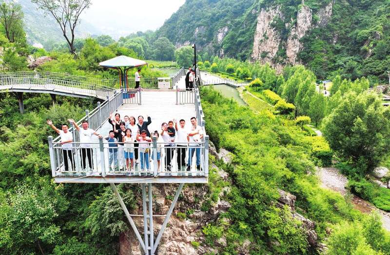 游客登临灵丘县车河村玻璃栈道,感受青山绿水中的“云端漫步”。